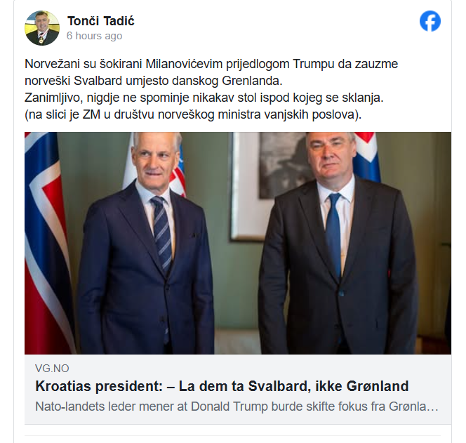 Predsednik Hrvatske Zoran Milanović izazvao je burne reakcije u međunarodnoj javnosti nakon izjava o Grenlandu i norveškom Svalbardu, o čemu pišu hrvatski mediji. Komentarišući najave iz SAD o mogućoj aneksiji ili kupovini Grenlanda, Milanović je poručio da je reč o kršenju međunarodnog prava i da Grenland pripada Danskoj.
