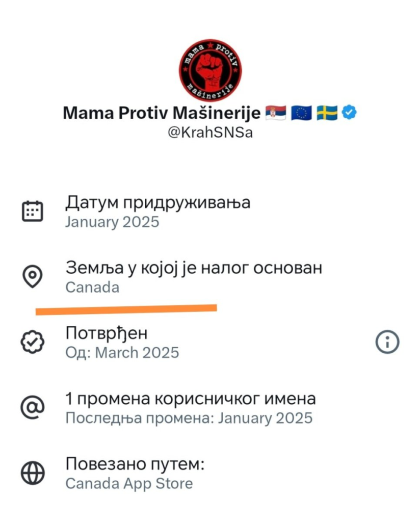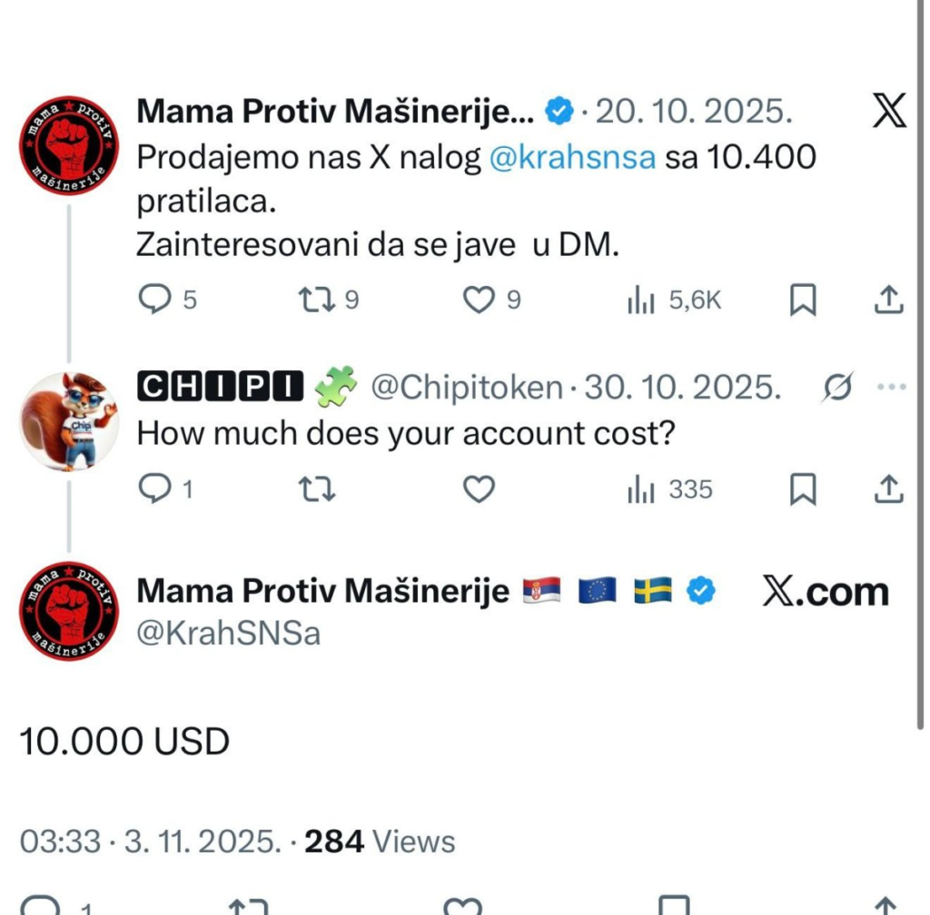 Nalog koji promoviše blokade u Beogradu, pod nazivom „Mama protiv mašinerije“, kreiran je u Kanadi i oglašen za prodaju po ceni od čak 10.400 dolara. U opisu oglasa navodi se da se prodaje X nalog sa 10.400 pratilaca, uz poziv zainteresovanima da se jave putem privatnih poruka.